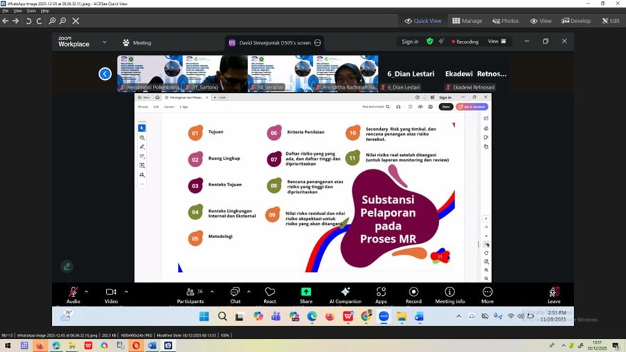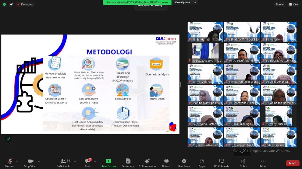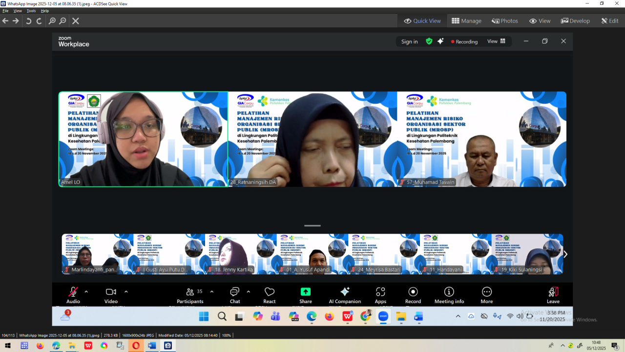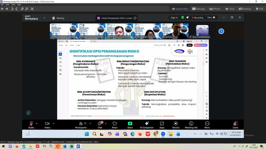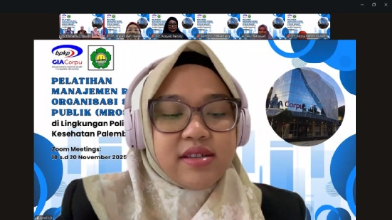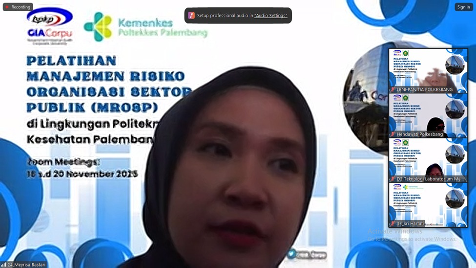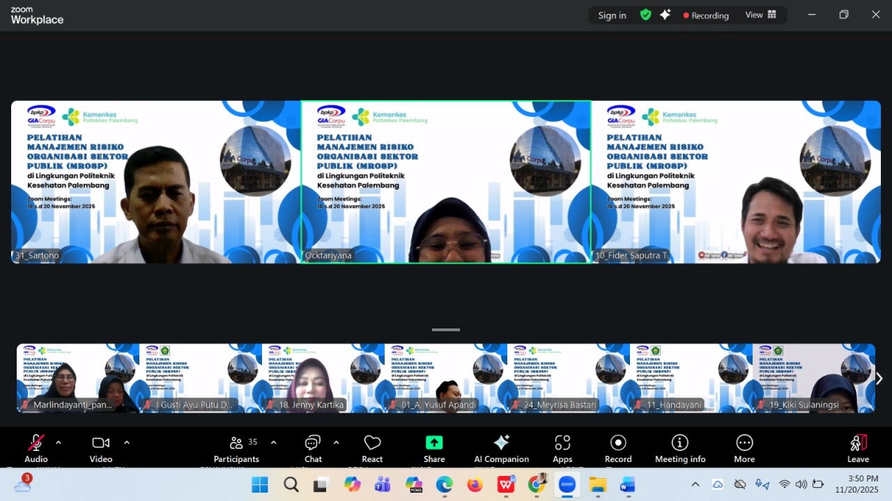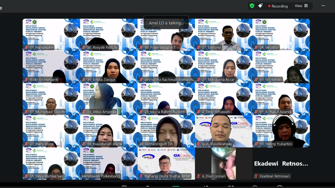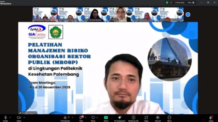 Untuk menambah pemahaman para pemilik maupun pengelola risiko, Kepala Unit Manajemen Risiko (Ibu Dr. Ocktariyana, SST., M.Kes, CRP) mengadakan Diklat Manajemen Risiko bagi para pemilik dan pengelola risiko di lingkungan Poltekkes Kemenkes Palembang melalui kerja sama dengan Badan Pengawasan Keuangan dan Pembangunan (BPKP) Government Internal Audit Corporate University (GIACorpu) yang dilaksanakan selama 3 hari sebanyak 35 peserta terdiri dari pemilik risiko, penanggungjawab kegiatan dan pengelola manajemen risiko, dosen, pengelola data, PLP, dan staf terkait manajemen risiko di Politekkes Kemenkes Palembang dengan metode daring via zoommeeting pada tanggal 18 – 20 November 2025.