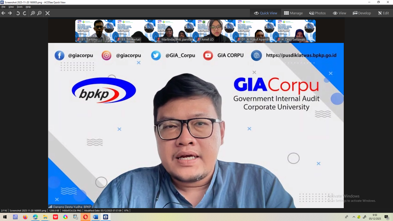 Kegiatan diklat MRSOP dari pihak BPKP GIACorpu yang dihadiri oleh (Bapak Danang Desta Yudha), beliau menyampaikan mengenai mekanisme penyelenggaraan diklat dan tata tertib yang harus dipatuhi selama pelaksananan diklat.