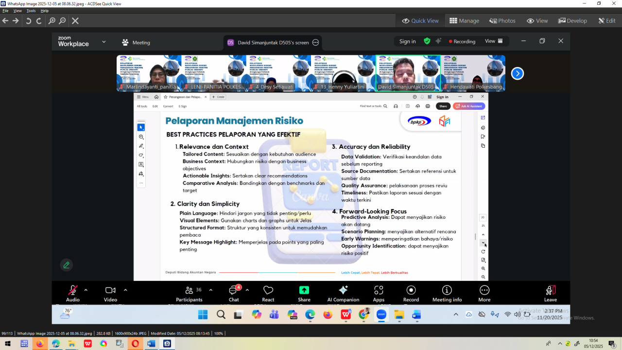 20 November 2025 (Kamis) – Bertempat di tempat kerja masing-masing peserta dilaksanakan penutupan diklat oleh Wakil Direktur II (Ibu Dra. Ratnaningsih Dewi Astuti, M.Kes.), dalam sambutannya beliau menyampaikan bahwa dengan mengucap rasa syukur Alhamdulillah, pada hari ini kita dapat berkumpul kembali dalam acara penutupan Diklat Manajemen Risiko Organisasi Sektor Publik di Poltekkes Kemenkes Palembang. Ucapan terima kasih beliau sampaikan kepada panitia Diklat BPKP (Bapak Danang Desta Yudha) bersama tim dan narasumber (Bapak Atanasius Widarwanto dan Bapak David Marisi Tua S) selama 3 hari ini telah memberikan bekal pengetahuan dan keterampilan yang sangat berharga bagi para peserta dalam mengelola risiko di lingkungan kerja masing-masing. Kami berharap ilmu dan pengalaman yang diperoleh selama diklat ini dapat diimplementasikan untuk meningkatkan kualitas layanan dan mencapai tujuan organisasi.