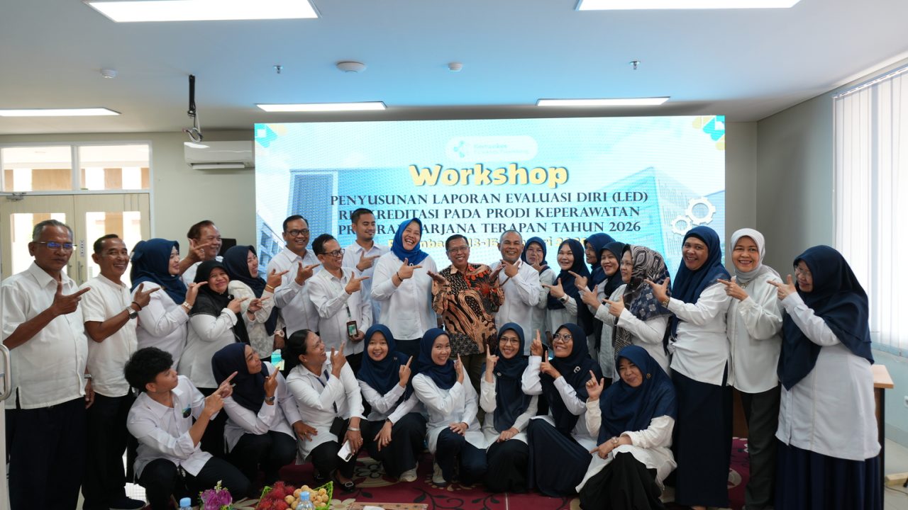 Palembang, 13 Januari 2026. Dalam upaya berkelanjutan untuk meningkatkan mutu pendidikan tinggi kesehatan, Politeknik Kesehatan Kementerian Kesehatan Palembang kembali menunjukkan komitmennya melalui penyelenggaraan Workshop Penyusunan Laporan Evaluasi Diri (LED) Reakreditasi pada Program Studi Keperawatan Program Sarjana Terapan Tahun 2026. Kegiatan strategis ini dilaksanakan selama tiga hari, Selasa hingga Kamis, 13–15 Januari 2026, bertempat di Gedung Kampus Sukabangun Poltekkes Kemenkes Palembang secara luring, serta diikuti pula secara daring melalui Virtual Zoom Meeting, sehingga memungkinkan partisipasi yang luas dan optimal.
