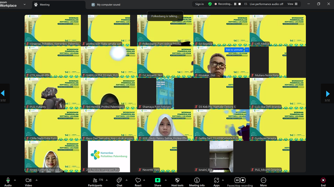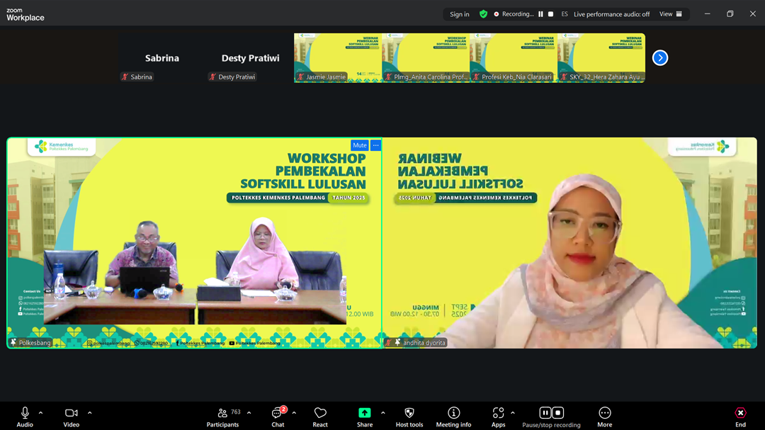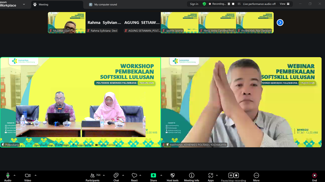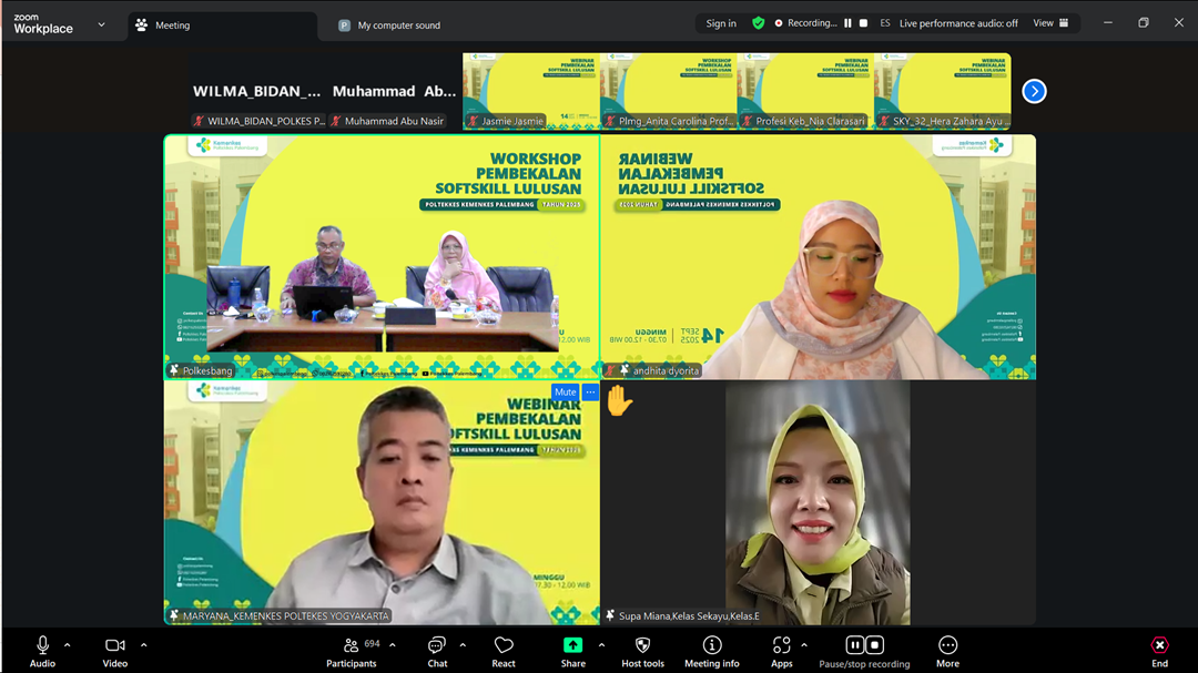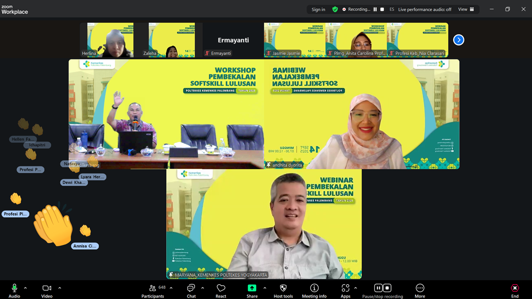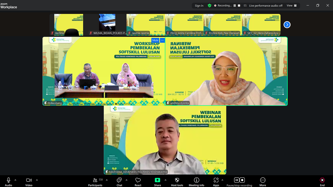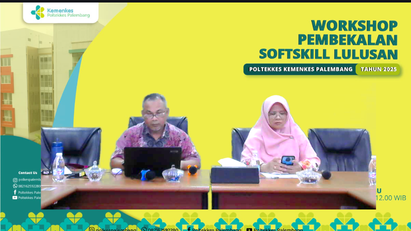 Palembang, 14 September 2025.Wakil Direktur III Poltekkes Kemenkes Palembang, Bapak Ns. Lukman, S.Kep., MM., M.Kep mewakili Direktur Poltekkes Kemenkes Palembang pada pembukaan “Pembekalan Softskill bagi Lulusan Poltekkes Kemenkes Palembang Tahun 2025”. Turut hadir pada pembukaan tersebut para Ketua Jurusan, Ketua Program Studi dan Koordinator/Penanggungjawab Kemahasiswaan secara daring (dalam jaringan). Sebanyak 1146 peserta yang mengikuti Webinar ini akan diberikan Sertifikat, yang bisa digunakan sebagai Surat Keterangan Pendamping Ijazah (SKPI).
