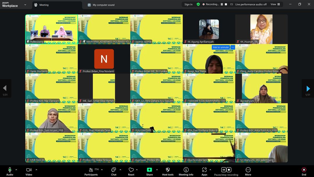 Webinar dengan tema “Menjadi Nakes Profesional: Soft Skill untuk Karier yang Sukses dan Berkah” menghadirkan Bapak Ns. Maryana, S.SiT.,S.Psi.,S.Kep.,M.Kep dan Ibu Andhita Dyorita Khoiryasdien.,S.Psi,M.Psi, Psikolog. Peserta sangat antusias mengikuti setiap materi yang disampaikan oleh narasumber, ditandai dengan banyaknya pertanyaan yang disampaikan oleh peserta, demikian pula dengan narasumber sangat bersemangat menjelaskan, membagikan pengalaman dan kiat-kiat menjadi tenaga Kesehatan yang professional.